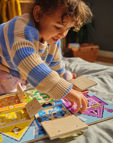 Questa tavola multiattività in legno offre ai bambini molteplici modi per esprimersi e imparare giocando. Sei diverse serrature da aprire e richiudere stimolano la manualità e l’ingegno, mentre dietro ogni porta o finestra si nascondono animali in numero corrispondente a quello indicato sulla superficie esterna, facilitando l’associazione tra numeri e quantità. Ogni porticina è inoltre caratterizzata da un colore diverso, per aiutare a riconoscere e memorizzare le tonalità in modo naturale e divertente.