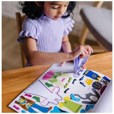 L’assortimento include quattro album di sticker riposizionabili, ciascuno dedicato a un tema diverso: vestiti, veicoli, città e habitat. Ogni album contiene 150 sticker e 5 pagine con paesaggi su cui applicarli. Gli sticker sono privi di colla, così da non danneggiare alcuna superficie: rimangono attaccati alle pagine finché non si decide di spostarli, permettendo un gioco creativo e senza limiti.