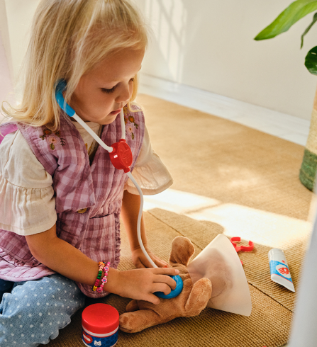 Due cuccioli hanno bisogno di cure! La visita inizia con tutti gli strumenti necessari a portata di mano: al cagnolino viene applicato un collare e la zampina viene fasciata con attenzione. Il gattino, invece, sembra avere bisogno di un gesso, da sistemare subito per assicurare una pronta guarigione. Una piccola puntura aiuta ad alleviare il dolore, seguita da qualche vitamina e da un rapido controllo alle orecchie. Terminata la visita, tutti gli strumenti possono essere riposti ordinatamente nella valigetta, pronti per essere utilizzati con il prossimo cucciolo da aiutare. Grazie a questo set, l’esperienza da piccolo veterinario risulta realistica e coinvolgente: ben 24 accessori ispirati a quelli veri, insieme a due cuccioli in peluche morbidissimi, rendono il gioco ancora più autentico e ricco di emozioni.
