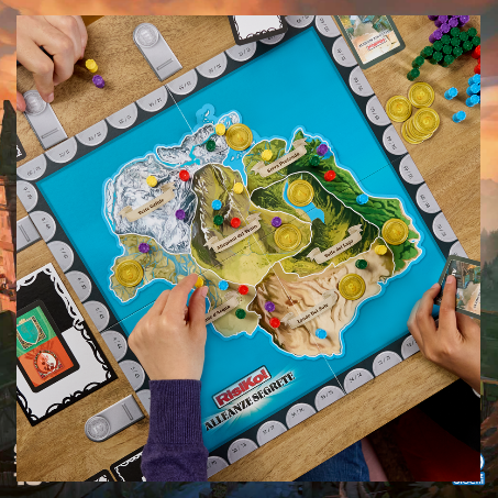Dopo le fortunatissime edizioni a tema RisiKo! Napoli, RisiKo! Antartide, RisiKo! Oceano e la Deluxe, il gioco di strategia più famoso e amato di sempre torna con Risiko! Alleanze Segrete, una nuova edizione che introduce un modo completamente diverso di giocare. Ambientata nel Medioevo con Torri, Casate e Armate, Risiko! Alleanze Segrete è la prima edizione nella storia di RisiKo! che non prevede l’uso dei dadi, senza però rinunciare agli elementi che da sempre rendono iconico il celebre gioco: la tensione, la strategia e il brivido dell’imprevisto. L’esperienza si concentra su alleanze segrete, bluff e diplomazia, offrendo una sfida ricca di tensione e colpi di scena.