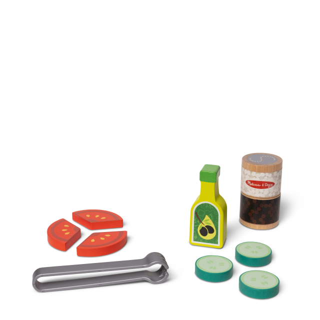 Mescola, condisci, gioca! I 28 pezzi realistici rendono l’insalatiera un’esplosione di divertimento. La lattuga è in tessuto con foglie staccabili, le verdure come peperoni e cetrioli sono in feltro e i crostini in legno. Include anche una ciotola capiente, cestello per mescolare e coperchio in legno per la centrifuga. Non manca nemmeno il condimento! Il set include un macinino di sale e pepe girevole in legno e una bottiglia di olio d’oliva. Per servire il tutto, ci sono una pratica pinza e una scheda riutilizzabile con attività. Un vero spasso da “condire” ogni giorno!