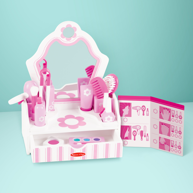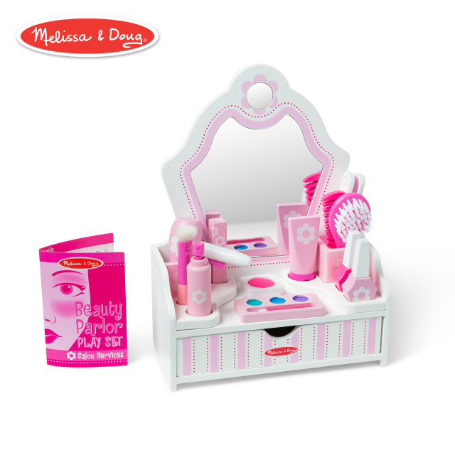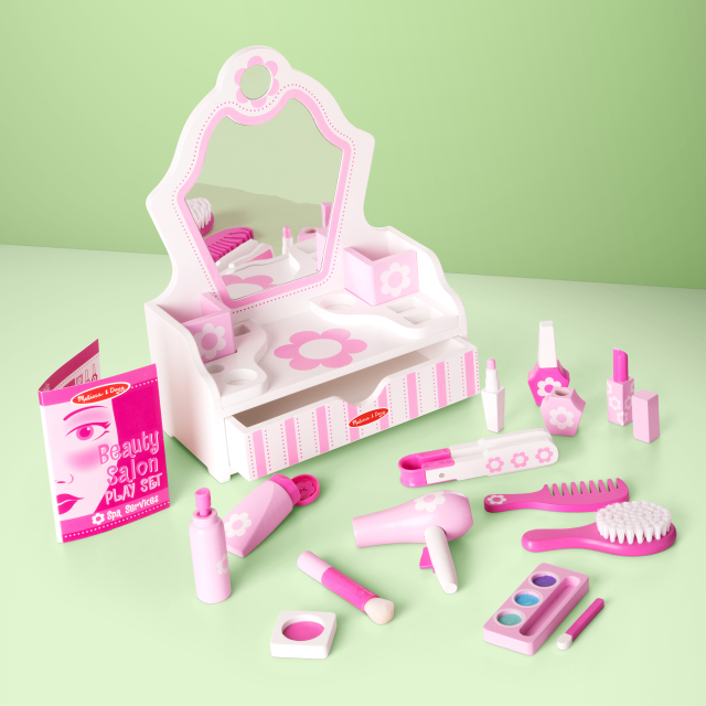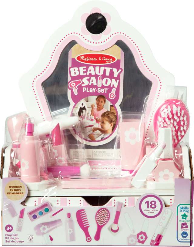 Questo salone di bellezza in legno include 18 accessori per trucco e parrucco! Asciuga i capelli con il finto phon, pettinali, spazzolali, piastrali e fissali con un po’ di lacca. Non appena avrai finito potrai dedicarti al make-up: si inizia con la crema, poi fard, ombretti e rossetto, ma il look non è completo se non si mette anche lo smalto! Uno spruzzo di profumo e voilà, pronti per specchiarsi. Una volta terminato il gioco basterà riporre tutto negli appositi scomparti e nel cassettino.