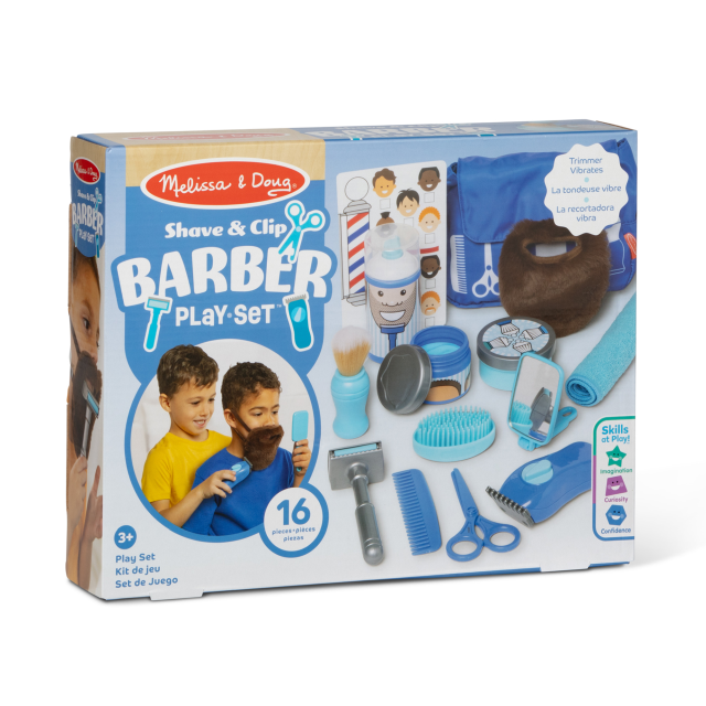 Andare dal barbiere non è mai stato così divertente: nella borsa ci sono tutti gli strumenti per realizzare un taglio barba perfetto. Prima di tutto va indossata la finta barba; dopodiché si può scegliere se procedere con il metodo con schiuma da barba e rasoio o con la macchinetta meccanica, ma in entrambi i casi il risultato sarà garantito! Un piccolo aggiustamento con le finte forbici, una pettinata, una spazzolata e voilà, un look perfetto! Grazie ai tanti accessori con funzionamenti differenti, barattoli che si aprono veramente, pulsantini che si premono e tanto altro, i bambini potranno cimentarsi in un’esperienza molto simile a quella reale.