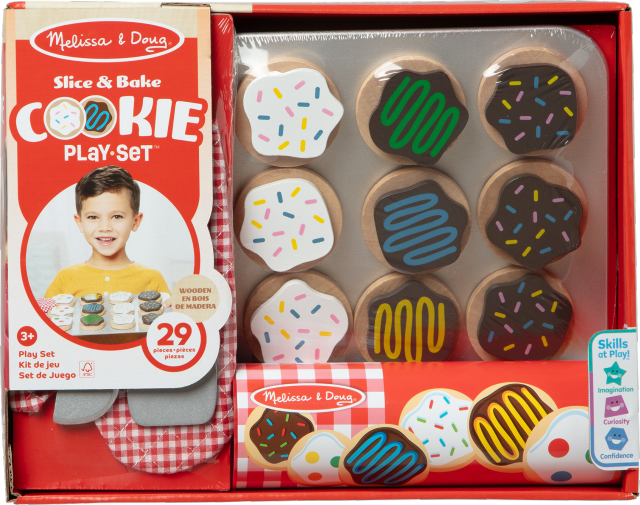 Per caso è l’ora dei biscotti? Prepara gustosi biscotti in legno: parti dalla base e tagliala a fettine grazie al coltello in legno, poi disponi tutto sul piano di lavoro e decora con glassa e zuccherini che si attaccheranno grazie al velcro. Una volta “cotti” potrai prenderli grazie alla palettina in legno e disporli nel tubo per biscotti, ma attenzione a non scottarti: usa il guanto per cucinare in sicurezza!