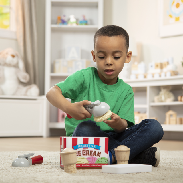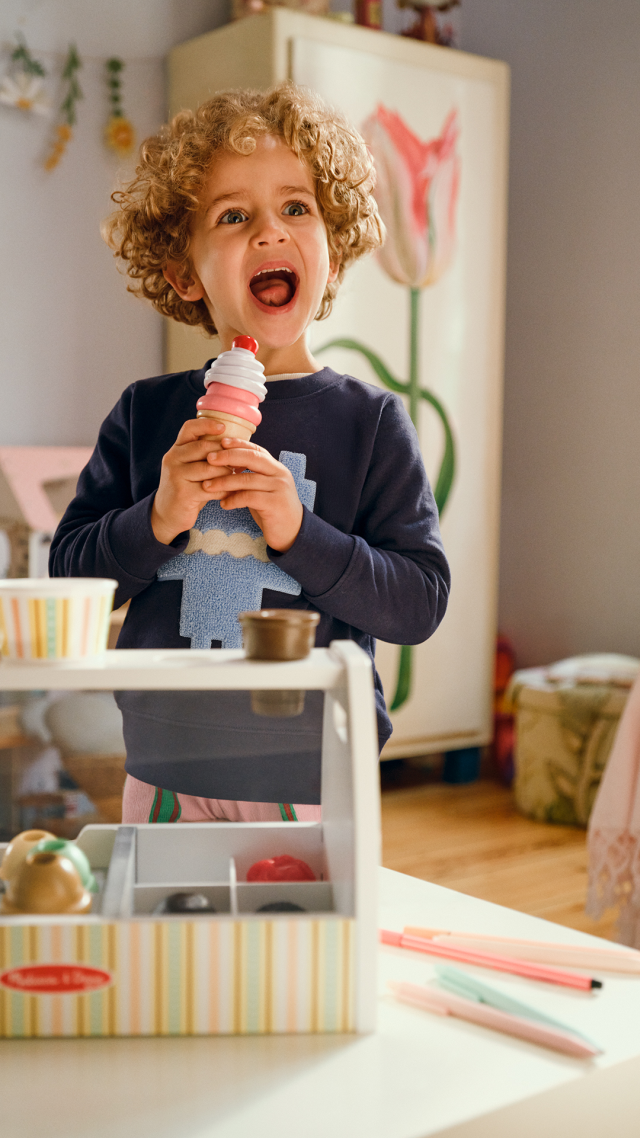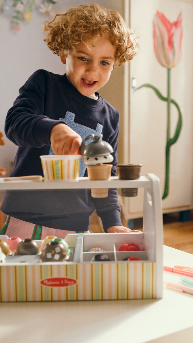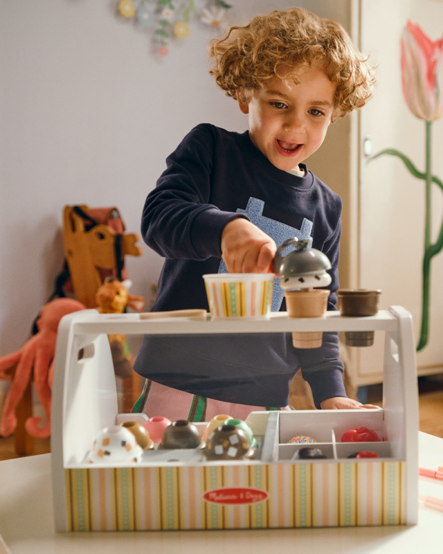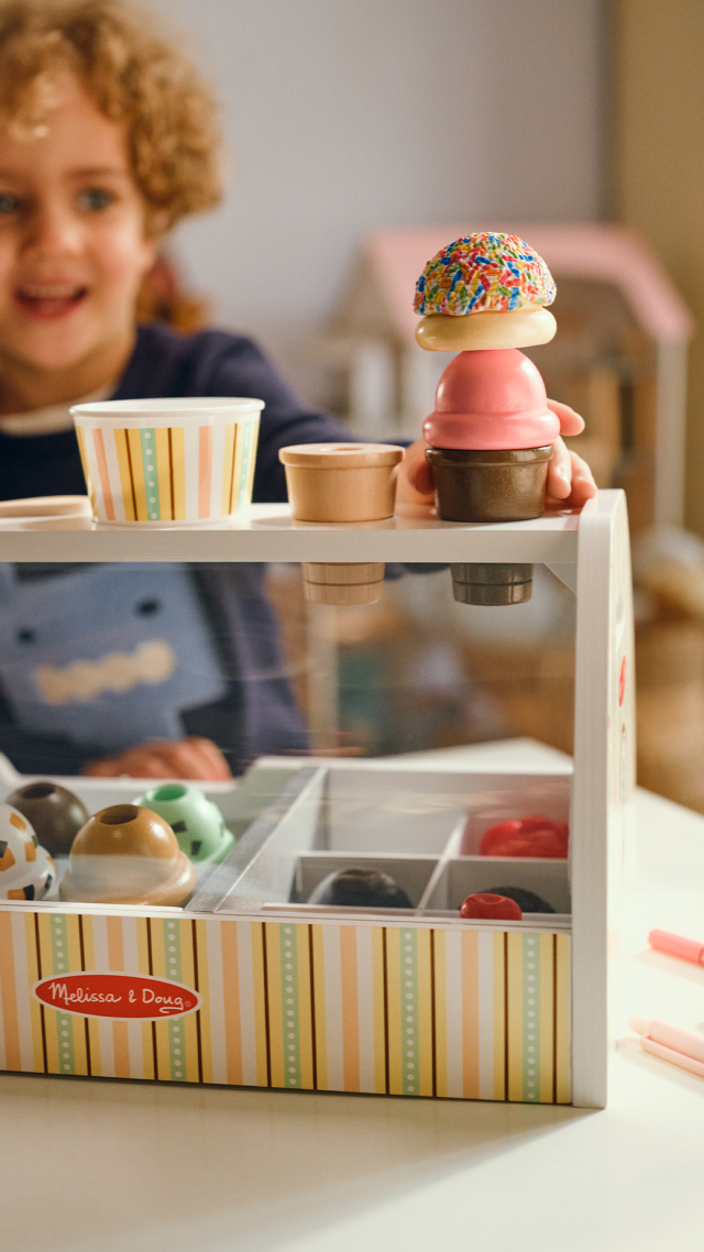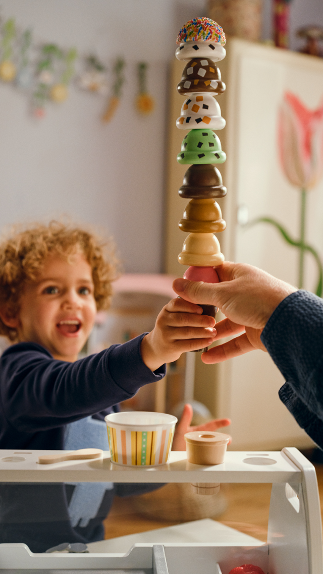 Cono o vaschetta da portare via? Prepara gustosi gelati finti utilizzando il cucchiaio magnetico: prendi una pallina di gelato e riponila sul cono con un semplicissimo gesto. Se una pallina non basta puoi aggiungerne altre! Se però vuoi portare a casa il tuo gelato, riponi le palline nella vaschetta. Grazie al movimento per raccogliere e riporre il gelato con il cucchiaio, i bambini potranno migliorare le loro abilità manuali e cimentarsi anche nel gioco del gelataio, interagendo con gli amici o con i genitori.