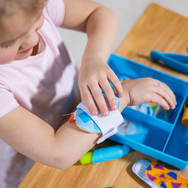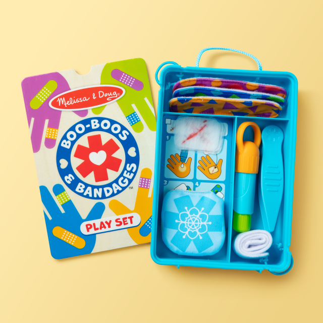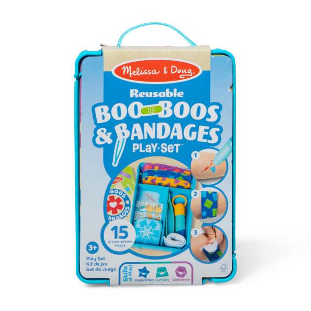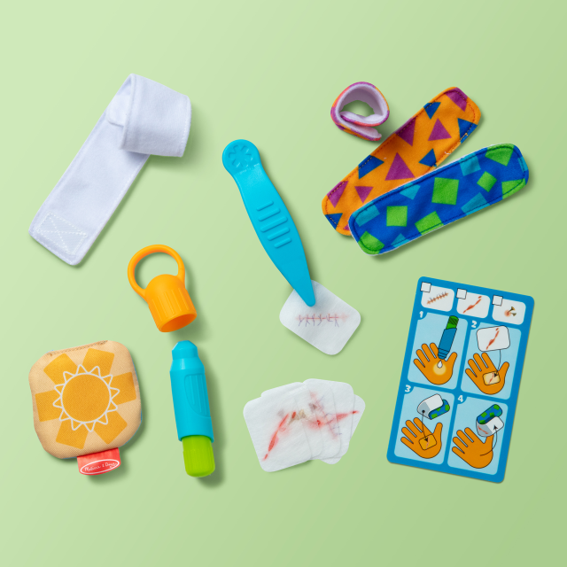 Riempi la pennetta con l’acqua e bagna le finte ferite per farle aderire alla pelle…sembreranno vere! Usa il ghiaccio finto, la fasciatura e i cerotti per curarti: applica un cerotto sopra la finta ferita e, grazie al velcro, una volta tolto il cerotto sarai guarito! Scegli fra 6 diverse ferite e 3 cerotti, usa le pinze per essere il più preciso possibile. Una volta terminato il gioco riponi il tappo sulla pennetta per non far uscire l’acqua e riponi tutto nella valigetta. Un’esperienza di gioco che aiuta a comprendere come prendersi cura delle ferite e non averne paura.