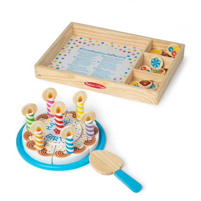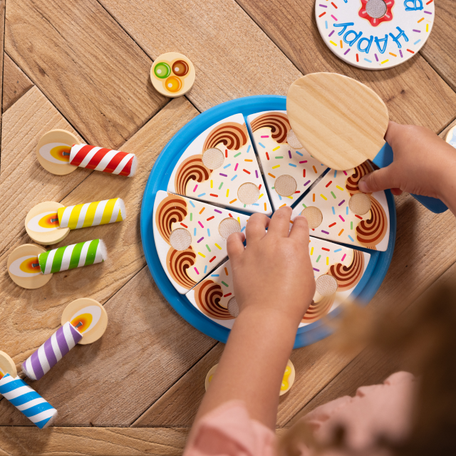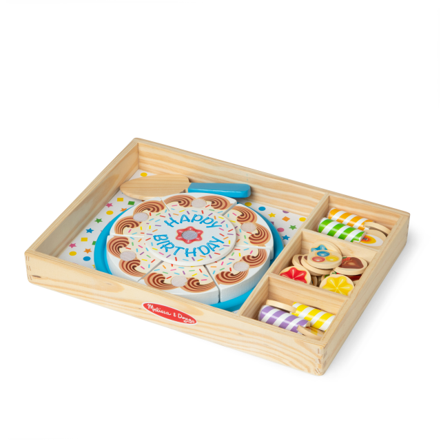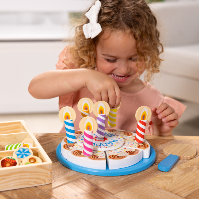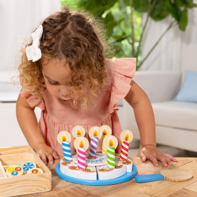 Crea la torta di compleanno perfetta, aggiungendo le candeline e le guarnizioni in legno! Attacca le 6 fette fra di loro, riponile sulla base per la torta e decora a piacimento prima di procedere al taglio con il coltellino in legno. Una volta terminato il gioco riponi tutto nel vassoio in legno con 4 scomparti
