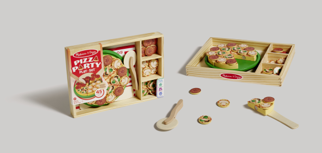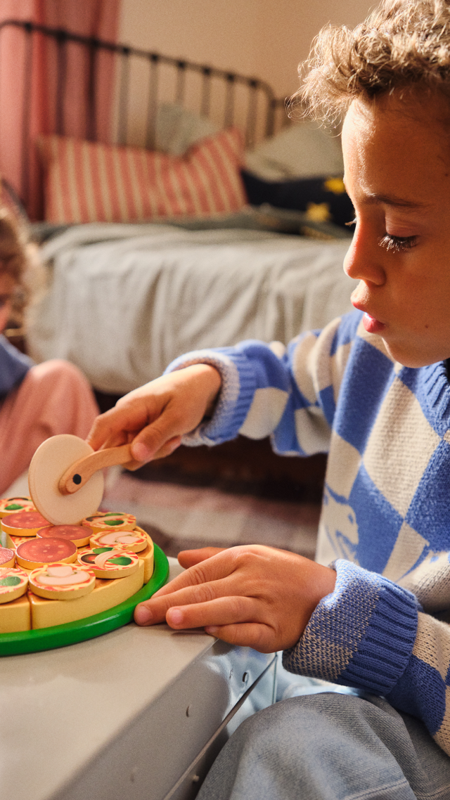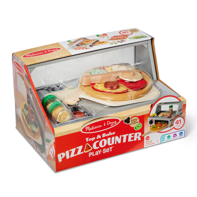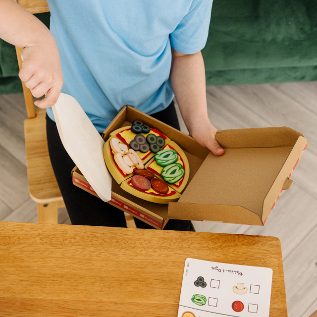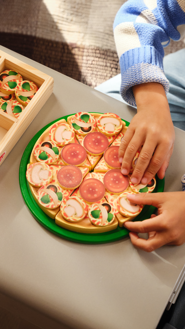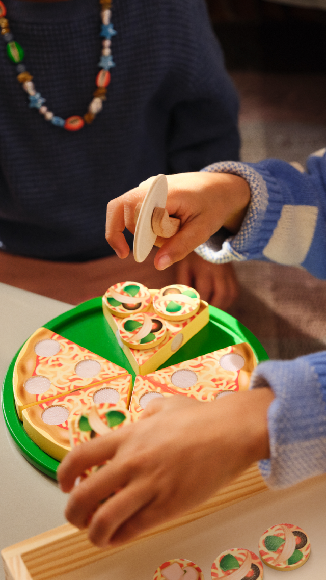 Qualcuno ha voglia di pizza? Unisci i 6 tranci, riponili sulla base e condisci la tua pizza con funghi, salame e tanto altro! Non appena sarà pronta, tagliala con la rotella in legno e servi i tranci con la spatola. Una volta terminato il gioco riponi tutto nel vassoio in legno con 4 scomparti per una perfetta organizzazione. Grazie a questo set i bambini potranno esercitarsi a contare, maneggiare diversi materiali e sperimentare il taglio della pizza in sicurezza.