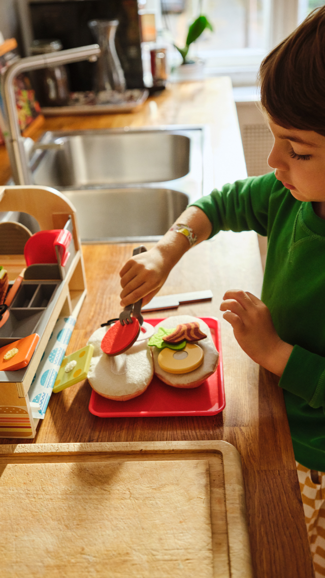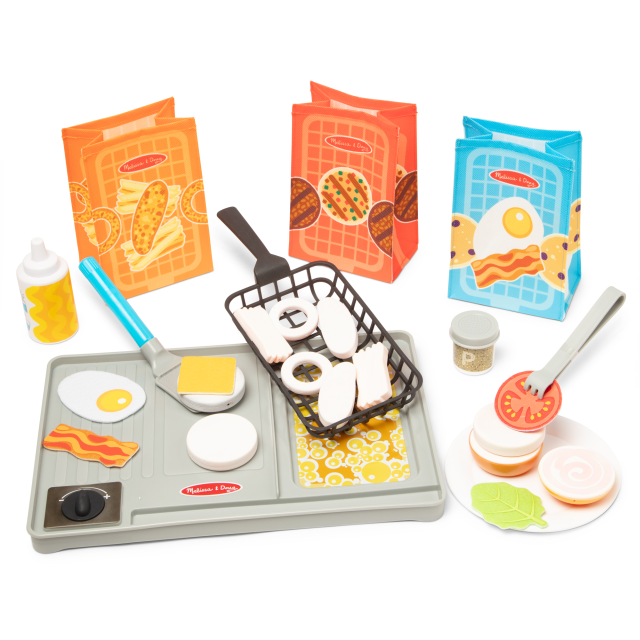 Aggiungi l’acqua e guarda hamburger, patatine, pesce fritto e anellini di cipolla cucinarsi a puntino grazie alla spatola che rilascia acqua! Ovviamente un hamburger non può essere completo senza uova, bacon, formaggio, pomodoro e insalata, tutti in tessuto per far sperimentare diverse consistenze nel gioco. Le patatine sono un po’ insipide…meglio aggiungere del sale! Shakera il dispenser del sale e guarda l’acqua uscire come se fosse davvero sale. Quando tutto il menù è pronto sarà possibile riporlo nei comodi sacchetti da asporto. Qualcuno voleva del Ketchup sul pane dell’hamburger? Nessun problema, abbiamo le salse a disposizione: dal barattolo esce acqua che va a colorare di rosso la base del panino. Un gioco iperrealistico per simulare l’esperienza della cucina con strumenti sicuri e divertenti.