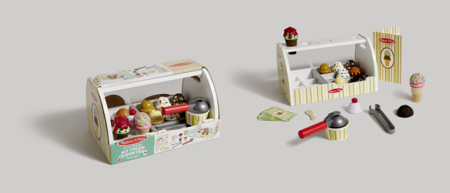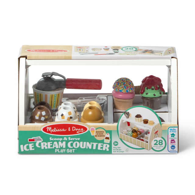 Diventa un gelataio con questo banchetto! Fai scegliere i gusti sul menù e chiedi se gradiscono cono o coppetta. Cono? Molto bene, prendiamo quello classico o quello al cacao e poi le palline di gelato scelte grazie al cucchiaio con un meccanismo a incastro. Impila 2, 3 o 4 palline di gelato e poi usa le pinze per aggiungere le guarnizioni. Mentre i clienti pagano con i soldi gelato, appoggia il cono sul bancone nell’apposito spazio per non farlo cadere. Contare, maneggiare utensili e sprigionare la fantasia sono le parole d’ordine per questo playset, che favorisce anche l’interazione con gli amici o con i genitori.