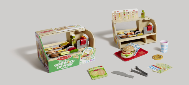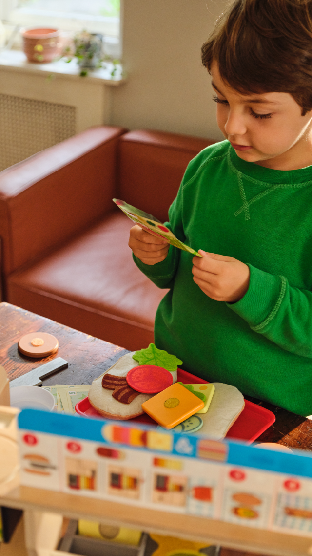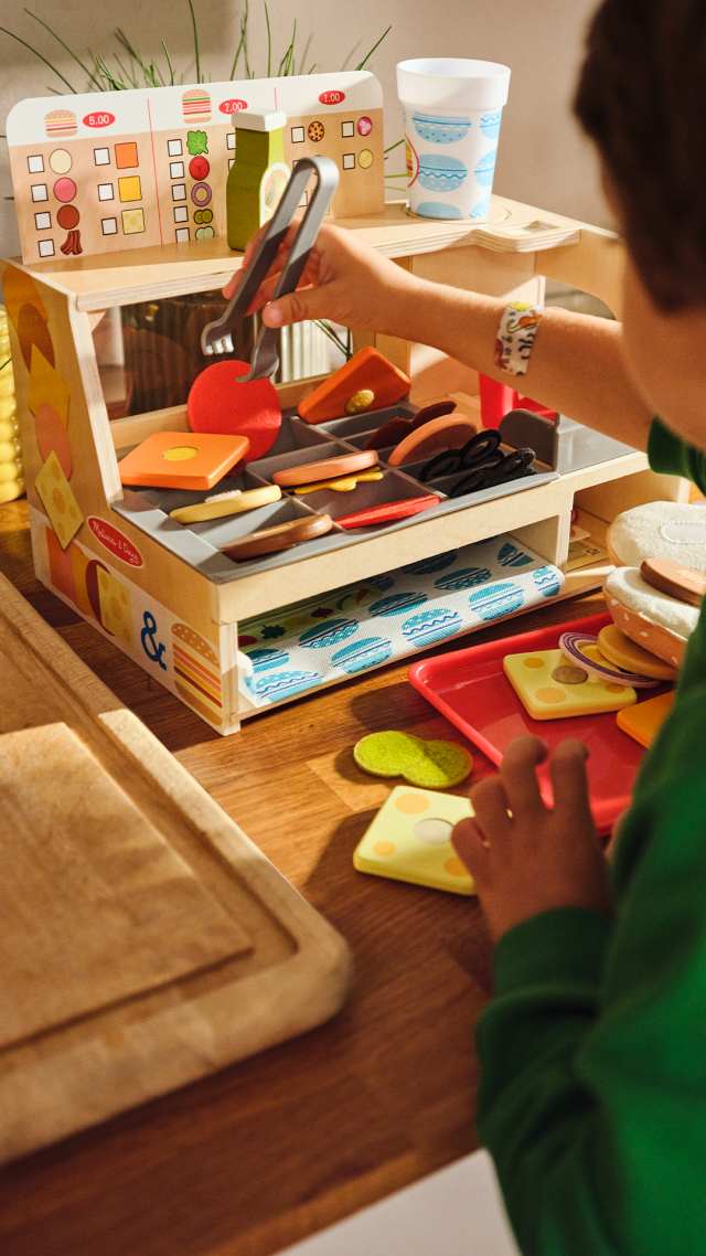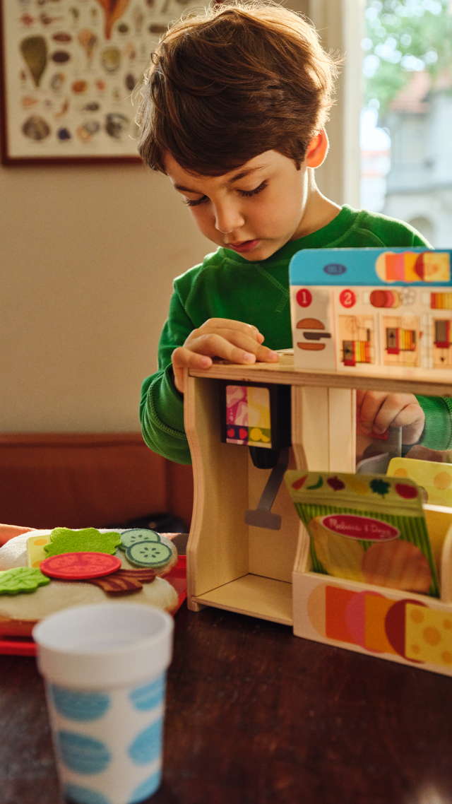 Crea gustosi sandwich giocattolo seguendo tutti i passaggi reali! Scegli dal menù il panino che più ti piace, predisponi il pane in tessuto sul vassoio, taglia carne e formaggio in legno con l’affettatrice e aggiungi gli altri ingredienti in stoffa: cipolla, olive, bacon, insalata e tanto altro. Condisci con l’olio e avvolgi il panino pronto nell’apposito involucro in stoffa. Al menù possono essere aggiunte le patatine in busta o un delizioso cookie e una bibita fresca da riempire per finta nel dispenser sul retro. Fai pagare il panino ai tuoi clienti e applica un timbro sulla loro carta fedeltà!