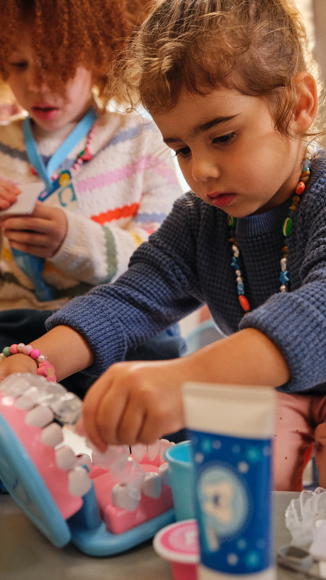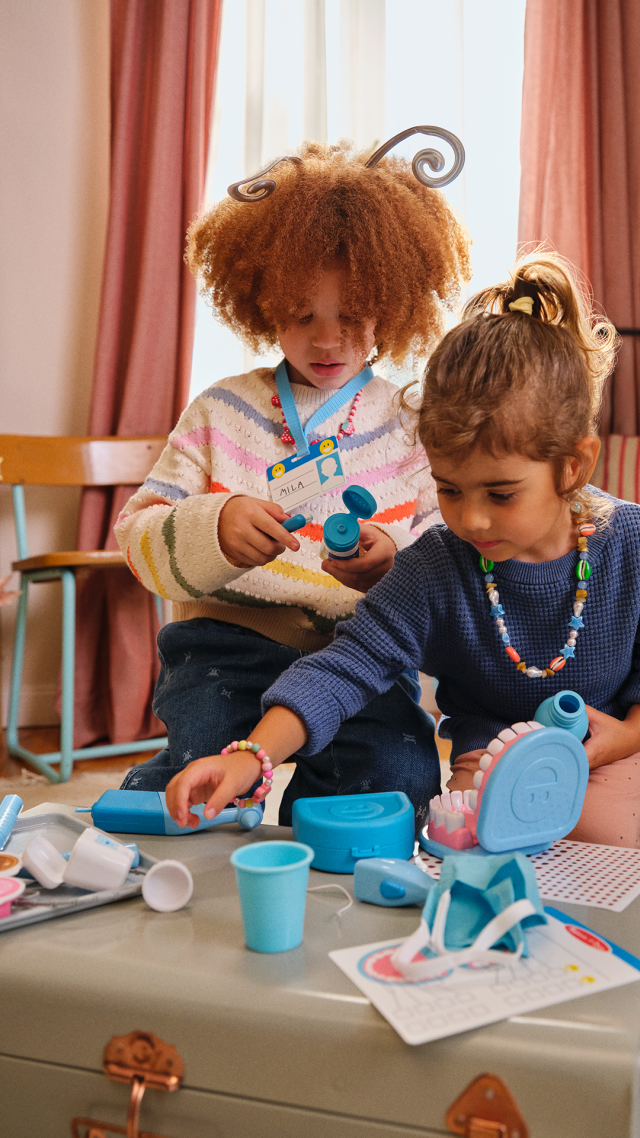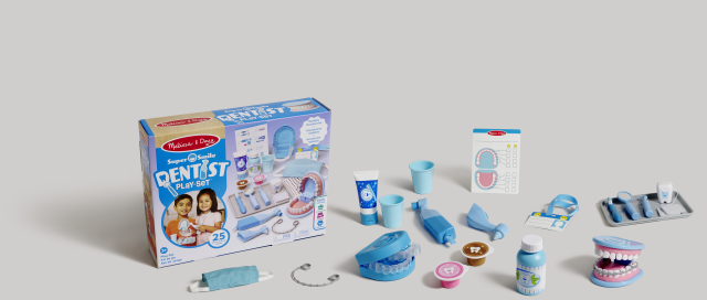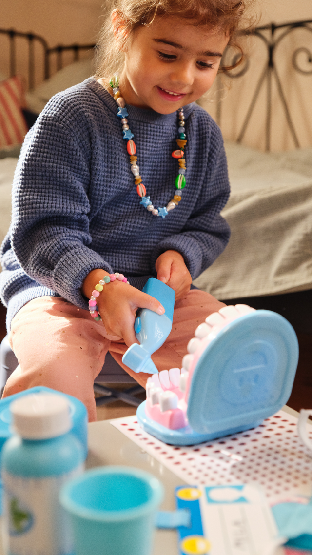 Un set da 25 pezzi per diventare dei piccoli dentisti! Supera la paura del dentista e impara a prenderti cura dei tuoi dentini grazie a un’esperienza di gioco iperrealistica: una finta bocca a cui applicare il bite, l’apparecchio, delle finte carie da rimuovere e tanto altro. Indossa la mascherina, utilizza lo specchietto per trovare i problemi tra i dentini, puliscili con spazzolino e filo interdentale, poi passa all’azione: usa lo strumento meccanico per rimuovere le carie e applica tutti i prodotti necessari. Usa il bicchierino per far risciacquare la bocca!
