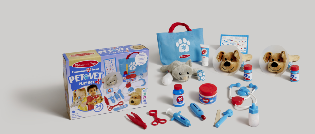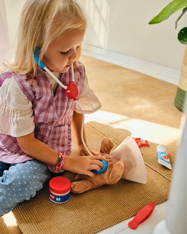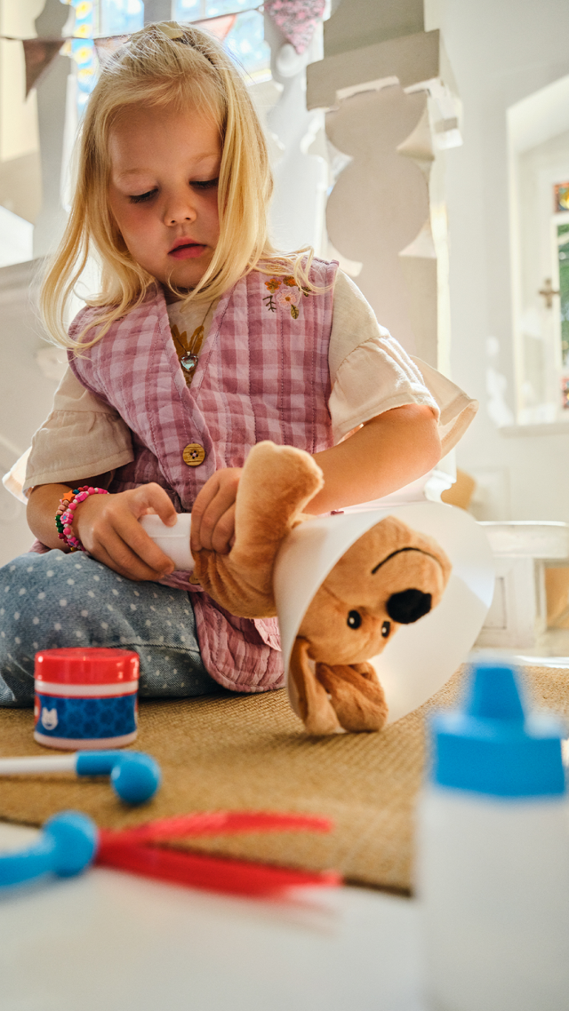 Due cuccioli sono feriti! Prima una breve visita con tutti gli strumenti del caso: il cagnolino ha bisogno di indossare il collare e inoltre la sua zampina va fasciata. Il gattino invece pare abbia bisogno del gesso, meglio applicarlo subito. Una punturina per non far sentire il dolore, qualche vitamina e infine un’occhiata alle orecchie. Visita terminata, il veterinario può riporre tutti gli strumenti nella valigetta e andare ad aiutare il prossimo cucciolo! Con questo set l’esperienza dei veterinari sarà super realistica: 24 accessori ispirati a quelli veri e due cuccioli in peluche morbidissimi.