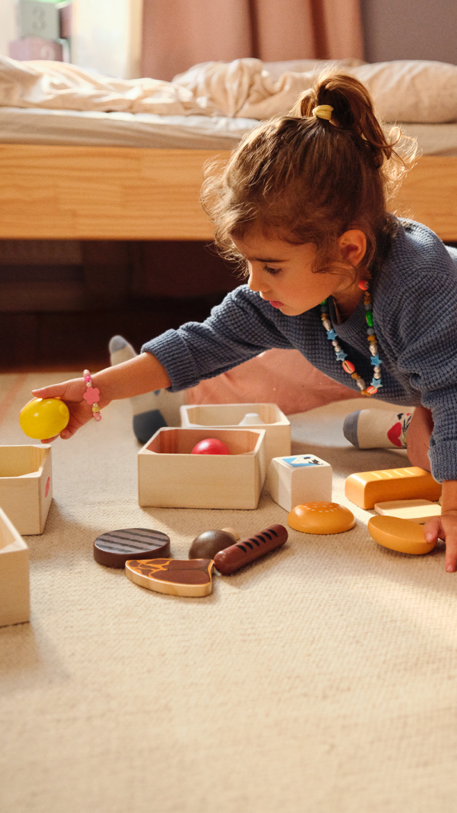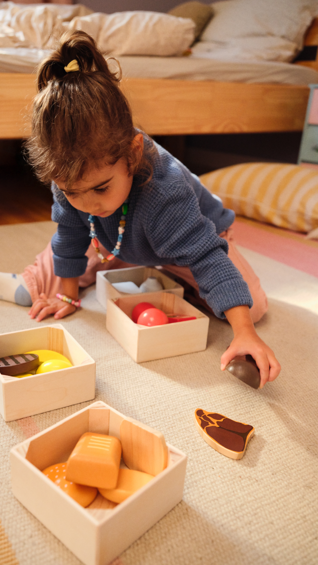 Questo set in legno aiuterà i bambini a ordinare il cibo in gruppi o a dividerlo per colori: pane, formaggi, carne e pesce o frutta e verdura? Ogni categoria ha la sua cassettina in legno per poter riporre tutto all’interno!