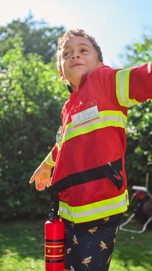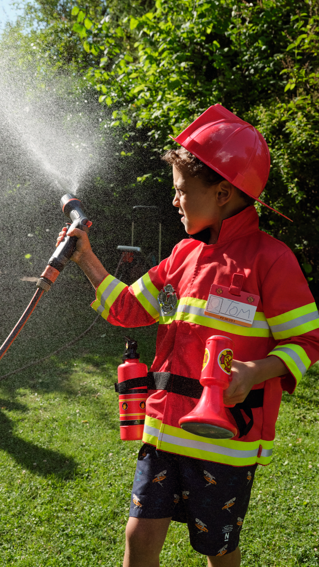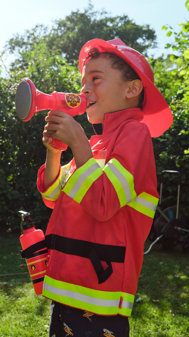 Diventa un piccolo pompiere con questo costume super dettagliato! Casco, giacca, tesserino di riconoscimento, megafono che suona davvero e altri strumenti creano il perfetto look di un pompiere professionista pronto a entrare in azione.