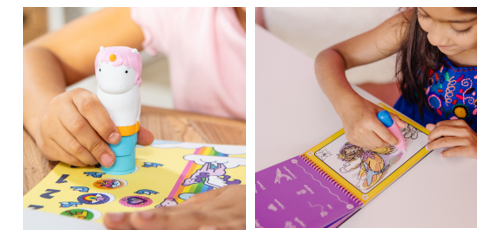In questo assortimento troverai 4 diversi libricini da decorare con gli sticker, ognuno con 24 pagine e una penna che contiene 300 sticker a tema: cuccioli, animali della savana, dinosauri e unicorni. Impugna la penna e attacca! Nulla di più semplice e soprattutto non temere gli sticker in giro perché non lasciano colla.