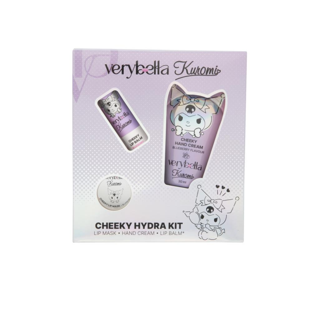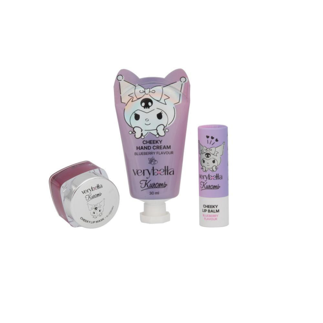 Un kit dedicato all’idratazione di labbra e mani. Tre pezzi personalizzati Kuromi di cui una crema mani da 30ml e due formule per le labbra: una maschera idratante e un lip balm. Comune denominatore? Il Mirtillo che dona una fragranza inconfondibile a tutti i prodotti.