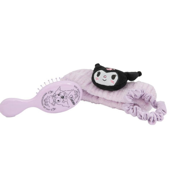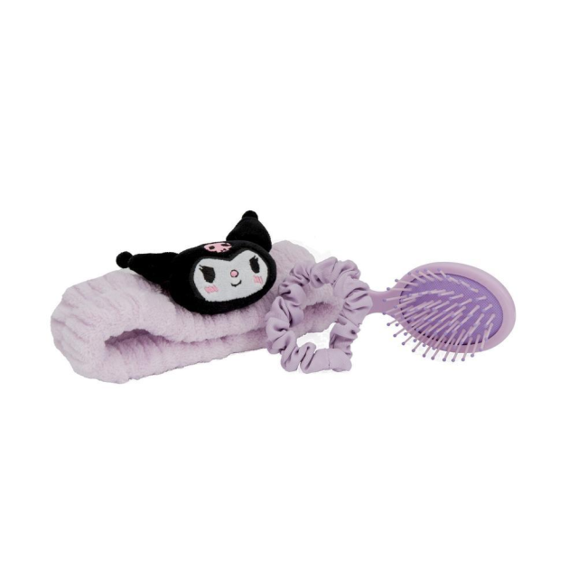 Un kit favoloso per le fan di Kuromi e appassionate di hair styling. Questo set si compone di una spazzola per capelli, di una fascia elastica in morbida spugna da indossare durante la skincare o l’applicazione del make up e un elastico per capelli. Tutto personalizzato Kuromi.